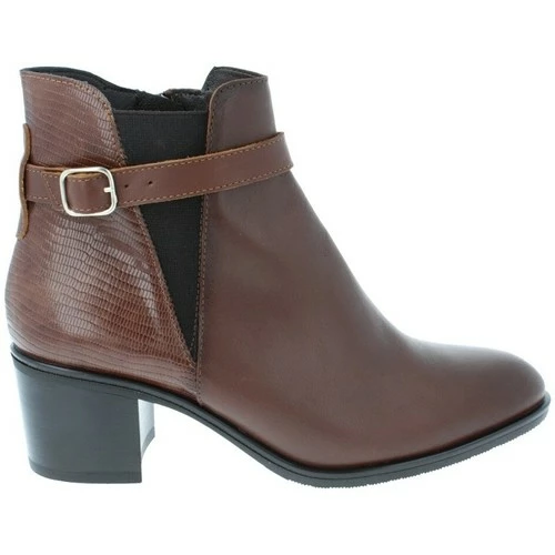 Bottines à talon, en cuir lisse sur l’avant et cuir serpent sur l’arrière.