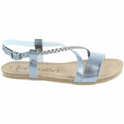 Sandale plate en cuir, lanières argentées et boucle anthracite. Semelle intérieure cuir avec AMOA gel system amortissant sous tout le pied. Semelle extérieure striée en EVA. Modèle extrêmement confortable.