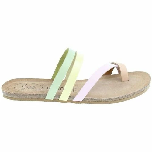 Sandale plate en cuir, tige vert, jaune, violet et orange. Semelle intérieure cuir avec AMOA gel system amortissant sous tout le pied. Semelle extérieure striée en EVA. Modèle extrêmement confortable.