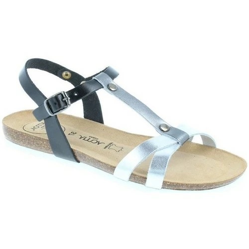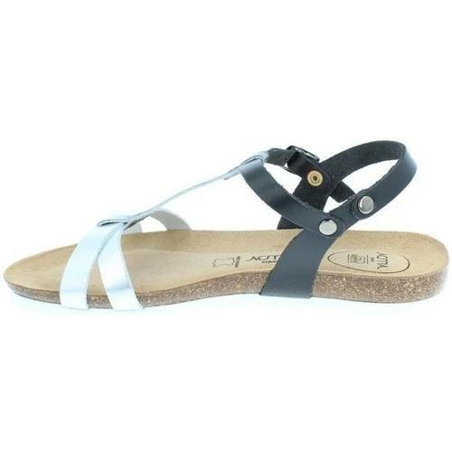 Sandale plate en cuir, tige noir et argent. Fermeture avec boucle argent. Semelle intérieure cuir avec AMOA gel system amortissant sous tout le pied. Semelle extérieure striée en EVA. Modèle extrêmement confortable.
