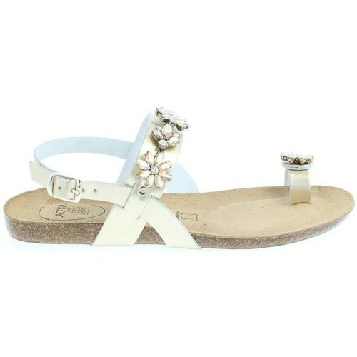 Sandale plate en cuir, tige or avec bijoux dorés. Semelle intérieure cuir avec AMOA gel system amortissant sous tout le pied. Semelle extérieure striée en EVA. Modèle extrêmement confortable.