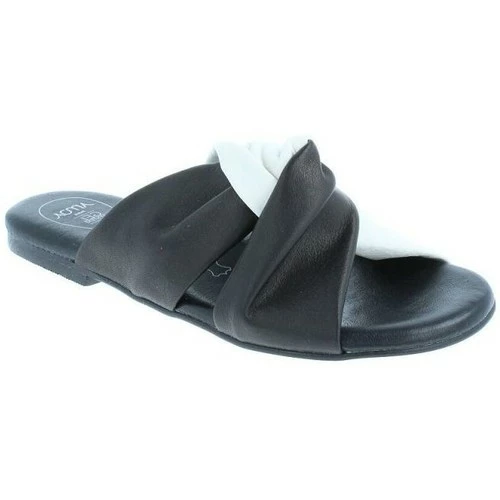 Sandale plate en cuir, brides noire et blanc. Semelle intérieure cuir noire avec AMOA gel system amortissant sous tout le pied. Semelle extérieure noire striée en EVA. Modèle extrêmement confortable.