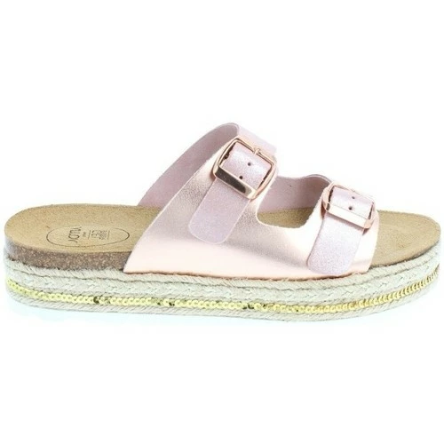 Sandale compensée plate en cuir, tige cuir rose brillant et cuir velours rose argenté. Boucle rose gold. Semelle intérieure cuir avec AMOA gel system amortissant sous tout le pied. Semelle extérieure striée en EVA. Modèle extrêmement confortable.
