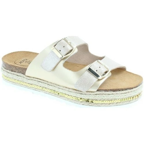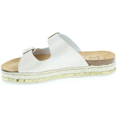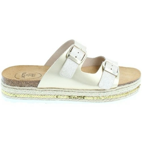 Sandale compensée plate en cuir, tige cuir or brillant et cuir velours beige doré. Boucle dorée. Semelle intérieure cuir avec AMOA gel system amortissant sous tout le pied. Semelle extérieure striée en EVA. Modèle extrêmement confortable.