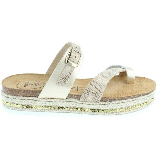Sandale compensée plate en cuir velours, tige beige brillant et cuir velours imprimé serpent beige. Boucle dorée. Semelle intérieure cuir avec AMOA gel system amortissant sous tout le pied. Semelle extérieure striée en EVA. Modèle extrêmement confortable.