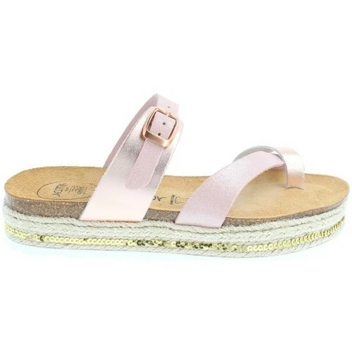 Sandale compensée plate en cuir velours, tige rose brillant et cuir velours rose. Boucle dorée. Semelle intérieure cuir avec AMOA gel system amortissant sous tout le pied. Semelle extérieure striée en EVA. Modèle extrêmement confortable.