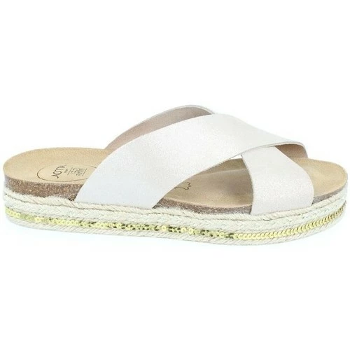 Sandale compensée plate en cuir. Bride croisée beige brillant et cuir velours beige. Semelle intérieure cuir avec AMOA gel system amortissant sous tout le pied. Semelle extérieure striée en EVA. Modèle extrêmement confortable.