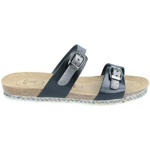 Sandale compensée plate en cuir, tige noir brillant et cuir velours argenté Boucle anthracite. Semelle intérieure cuir avec AMOA gel system amortissant sous tout le pied. Semelle extérieure striée en EVA. Modèle extrêmement confortable.