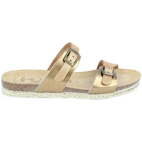 Sandale compensée plate en cuir, tige marron brillant et cuir velours doré. Boucle dorée. Semelle intérieure cuir avec AMOA gel system amortissant sous tout le pied. Semelle extérieure striée en EVA. Modèle extrêmement confortable.