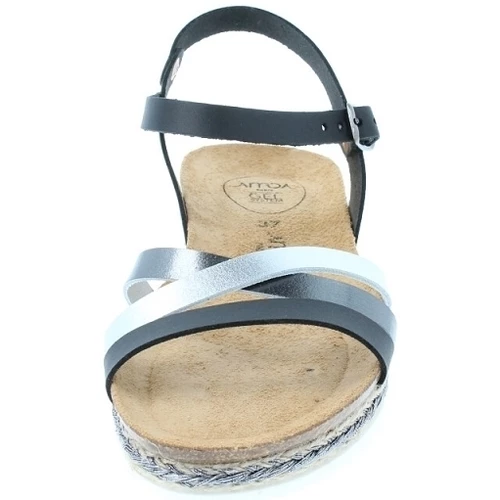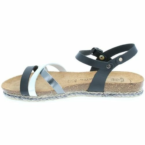 Sandale plate en cuir, bride noire avec fermeture à boucle argentée et triple lanière blanc, argent et noire à l’avant. Semelle intérieure cuir avec AMOA gel system amortissant sous tout le pied. Semelle extérieure striée en EVA. Modèle extrêmement confortable.