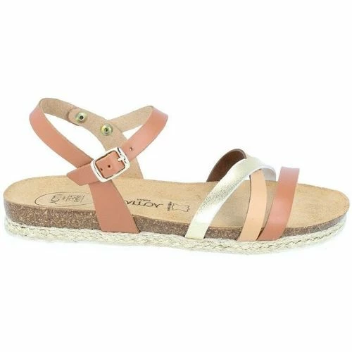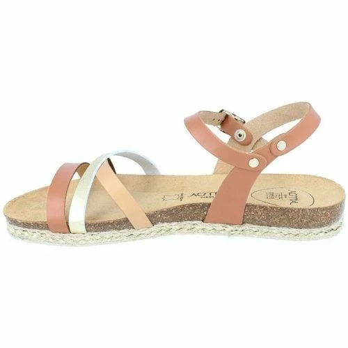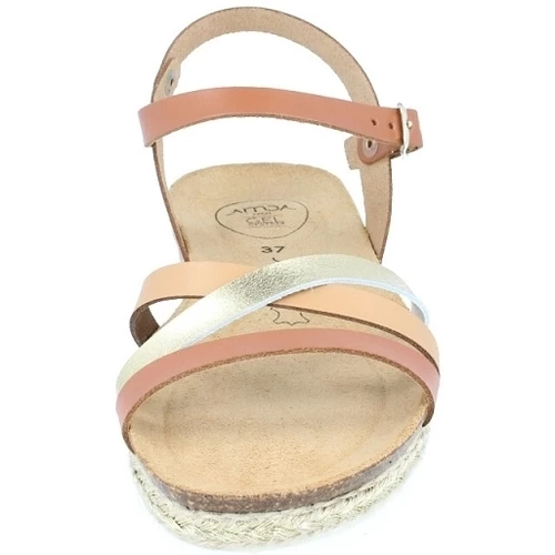 Sandale plate en cuir, bride maron avec fermeture à boucle argentée et triple lanière marron, orange, et argent à l’avant. Semelle intérieure cuir avec AMOA gel system amortissant sous tout le pied. Semelle extérieure striée en EVA. Modèle extrêmement confortable.