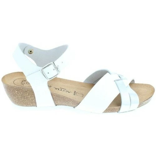 Sandale compensée en cuir, bride blanche avec fermeture à boucle argentée et triple lanière blanc et argent à l’avant. Semelle intérieure cuir avec AMOA gel system amortissant sous tout le pied. Semelle extérieure striée en EVA. Modèle extrêmement confortable.