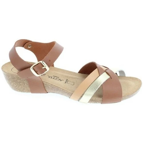 Sandale compensée en cuir, bride maron avec fermeture à boucle argentée et triple lanière marron, orange, et argent à l’avant. Semelle intérieure cuir avec AMOA gel system amortissant sous tout le pied. Semelle extérieure striée en EVA. Modèle extrêmement confortable.
