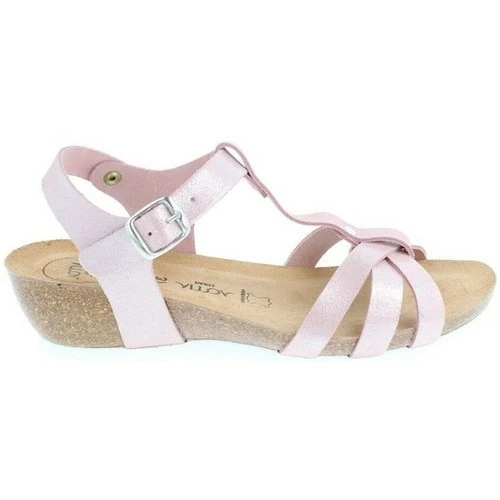 Sandale compensée en cuir, tige rose argenté et boucle argent. Semelle intérieure cuir avec AMOA gel system amortissant sous tout le pied. Semelle extérieure striée en EVA. Modèle extrêmement confortable.