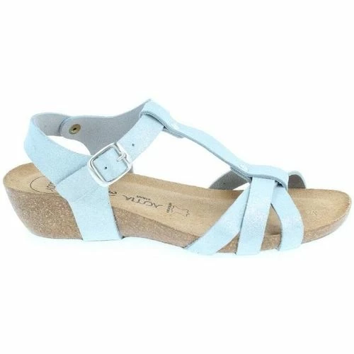 Sandale compensée en cuir, tige bleu argenté et boucle argent. Semelle intérieure cuir avec AMOA gel system amortissant sous tout le pied. Semelle extérieure striée en EVA. Modèle extrêmement confortable.