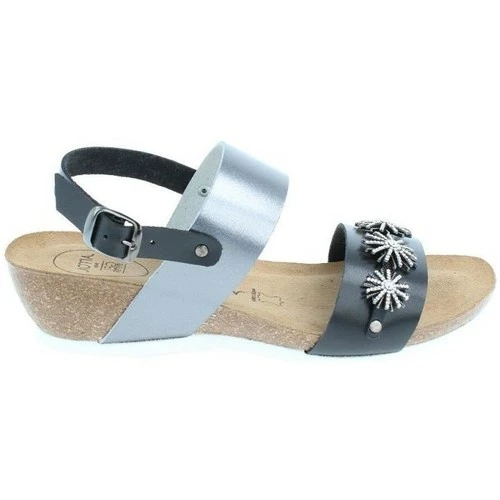 Sandale compensée en cuir, lanière argentée et noire avec fermeture à boucle argent. Lanière noire avec bijoux à l’avant. Semelle intérieure cuir avec AMOA gel system amortissant sous tout le pied. Semelle extérieure striée en EVA. Modèle extrêmement confortable.