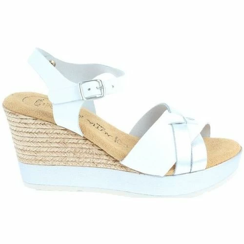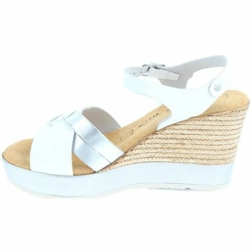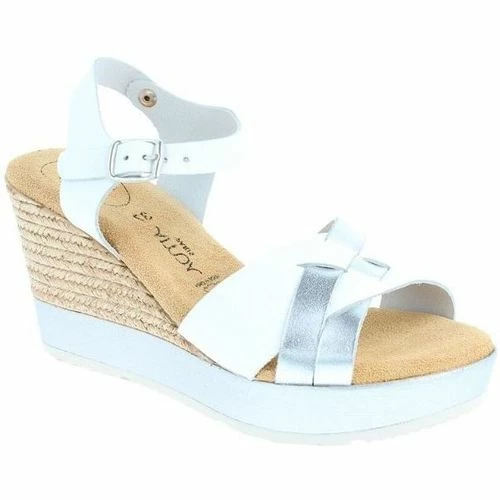 Sandale compensée en cuir, lanières blanc et argent. Fermeture avec boucle argent. Semelle intérieure cuir avec AMOA gel system amortissant sous tout le pied. Semelle extérieure striée en EVA. Modèle extrêmement confortable.