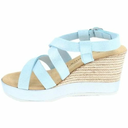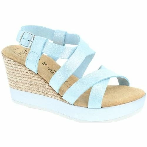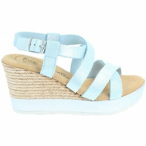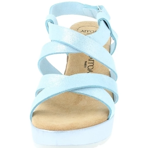 Sandale compensée en cuir, lanières bleu argenté. Fermeture avec boucle argent. Semelle intérieure cuir avec AMOA gel system amortissant sous tout le pied. Semelle extérieure striée en EVA. Modèle extrêmement confortable.
