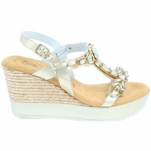 Sandale compensée en cuir, tige beige avec bijoux argenté. Fermeture avec boucle dorée. Semelle intérieure cuir avec AMOA gel system amortissant sous tout le pied. Semelle extérieure striée en EVA. Modèle extrêmement confortable.